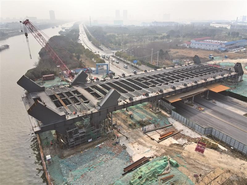 上午10时,记者在运河西路南匝道与菱湖大道交叉口附近的施工现场看到,深灰色钢结构边跨下部结构已施工完毕,60多名工人和多部大型吊装机械在运河两岸忙碌着,一头是老城区火车站附近兴源路,一头是新吴区菱湖大道,中间是水运繁忙的京杭运河,一座大桥打通了老城与太湖新城之间一条新通道。