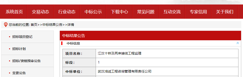 今天(6月29日),武汉市公共资源交易中心官网发布《江汉十桥及两岸接线工程监理》中标结果公告。