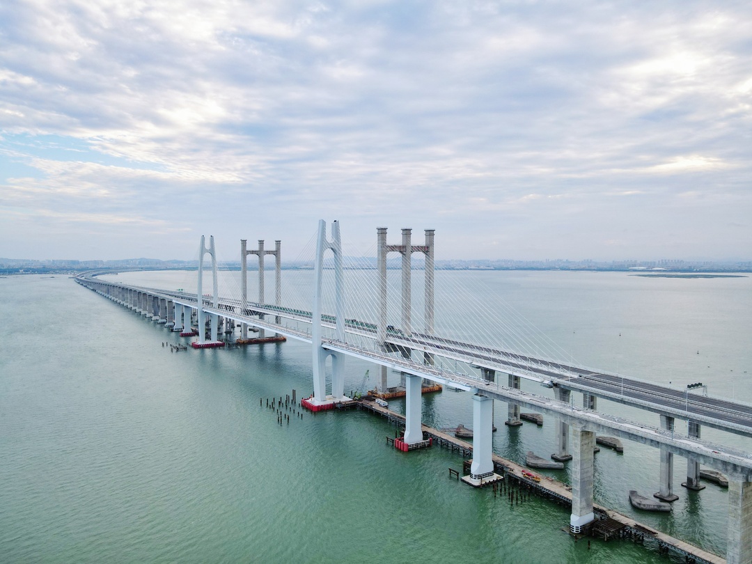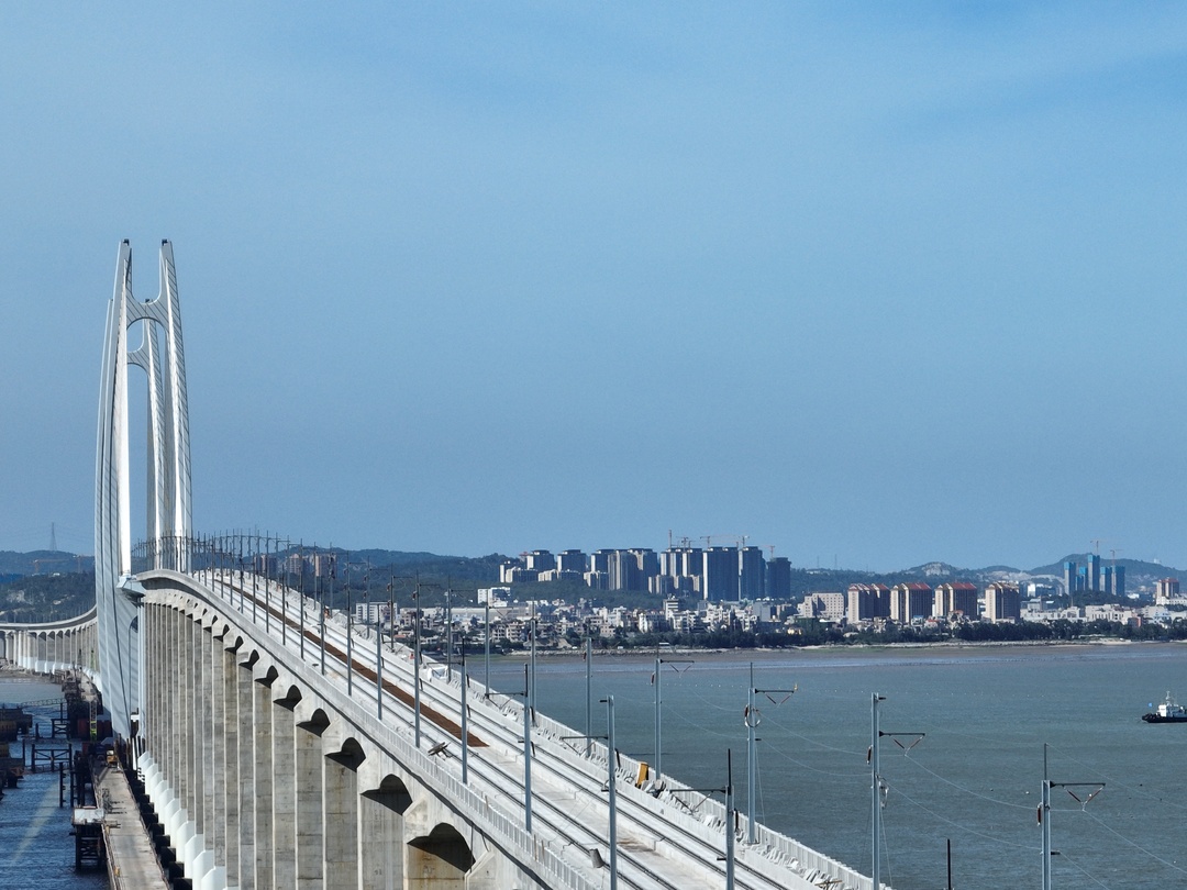 此次完成无砟轨道施工的泉州湾跨海大桥为全线重点控制性工程,全长20公里,海域施工长度9公里,主桥长800米、主跨400米,为双塔双索面钢混结合梁半漂浮体系斜拉桥,是国内首座跨海高铁桥。