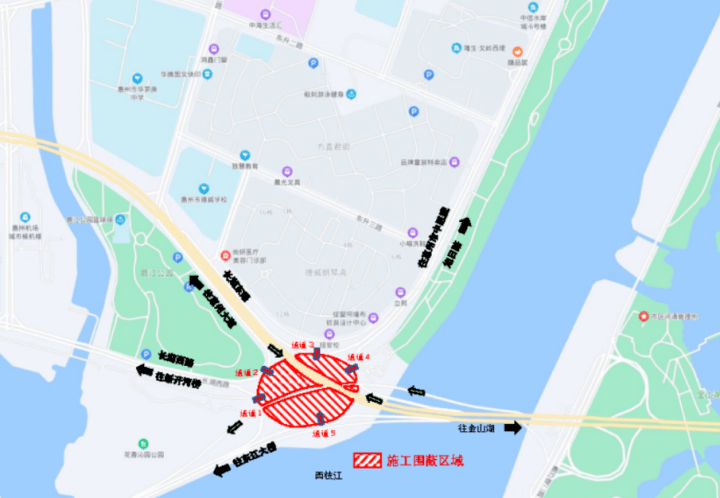 惠州交警提醒,请注意提前规划选择合适的路线出行。途经施工路段的车辆要按照绕行提示和交通标志减速慢行,并服从现场工作人员的指挥疏导。