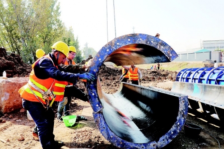 在该项目二标段,工程进度也是“一天一个样”。站在高处远眺,近400名建设工人、60台施工机械正分散在不同区域忙碌地作业。在该标段太榆退水渠桥梁节点,参建团队严格把控工程质量,正在通过超声波对桩基进行检测。旁边,一组高大粗壮的墩柱已拔地而起。“二标段主要难点集中在桥梁施工部分。首先,打桩要在太榆退水渠水中进行,地下土壤液化严重;其次,因太榆退水渠担负着沿线等地的生活污水、工业废水和降雨径流的排泄功能,必须保证截面径流量;第三,受施工场地限制,施工只能分步进行。”现场施工负责人介绍,为克服这些困难,项目部通过加强力量、建立机制、明确任务、规范管理等措施,不断加快推进项目建设进度。为了加强质量控制,通过不断优化墩柱施工工艺,在原材选择、钢筋绑扎、模板拼接、混凝土振捣、成品养护等一系列环节上实现对细节的严格把控。